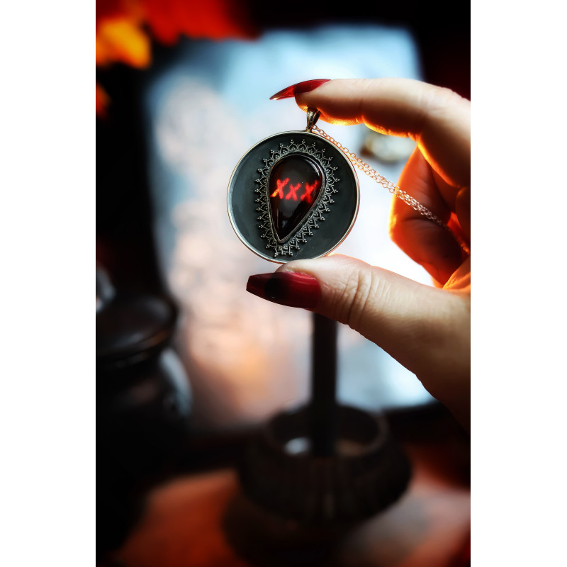 Collier ~ La Reine du Vaudou ~ talisman en argent massif 925.Protégeant une merveilleuse pierre de grenat hessonite au rouge flamboyant. Au cœur du médaillon, comme un secret bien gardé qui ne se révélera qu'à la lumière de votre magie, trois croix pour accueillir tous vos vœux