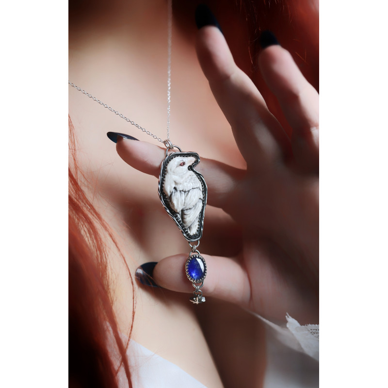 Collier ~ Les Envoyés du Froid ~ talisman en argent massif 925, Chacun protège un incroyable corbeau blanc, réalisé en porcelaine froide faite, à la main, par une artisane et consœur Ukrainienne. Accompagnés de merveilleux saphirs bleu, une pierre d'une qualité unique, aux reflets de magie