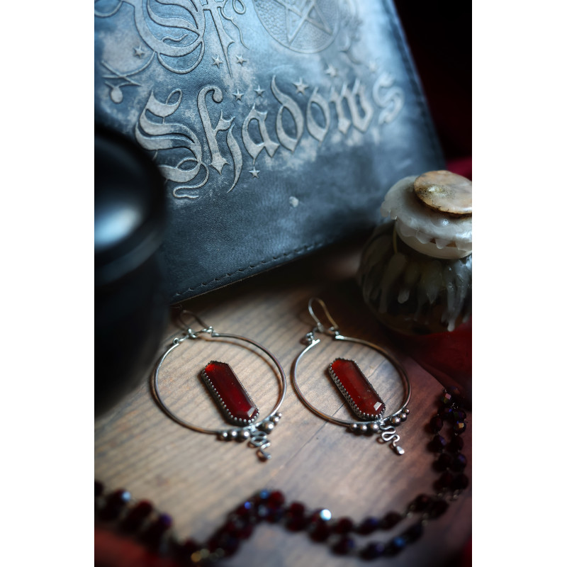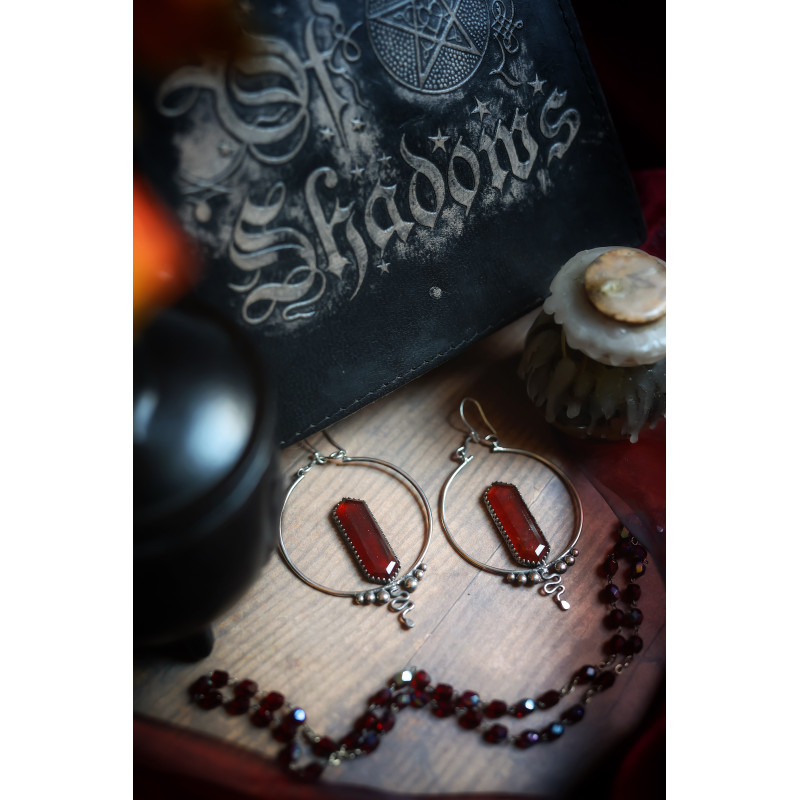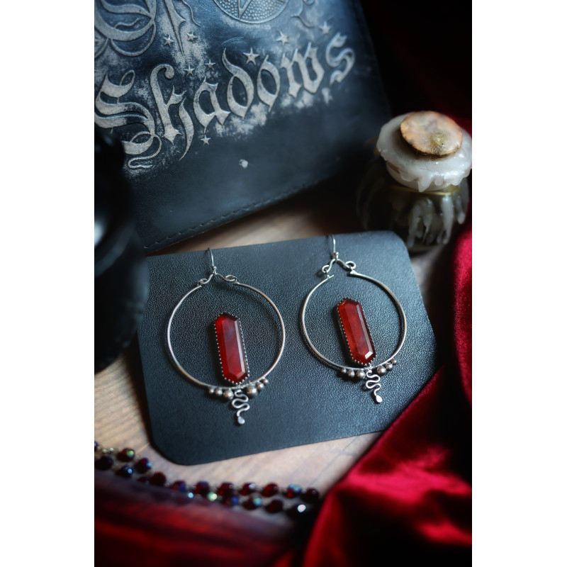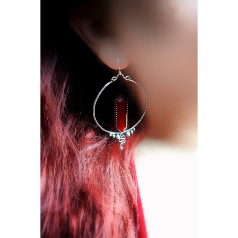 Boucles d'oreilles ~ Les gardiens du passage ~ en argent massif 925. Dans un esprit créoles, protégeant de merveilleuses pierres de grenat hessonite au rouge puissant, et ornées de petits serpents protecteurs