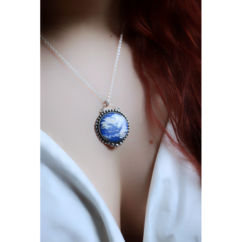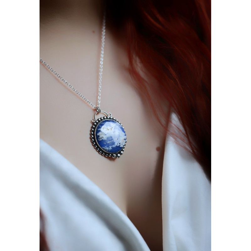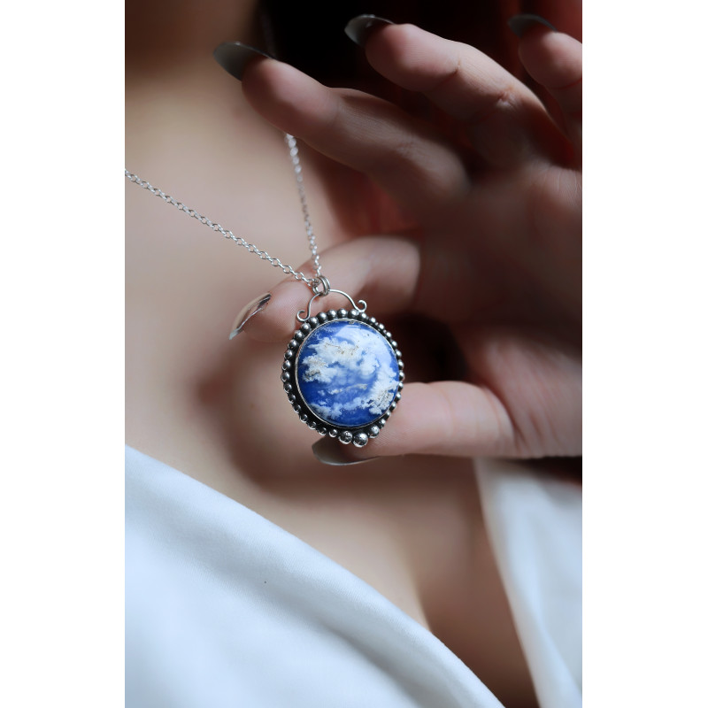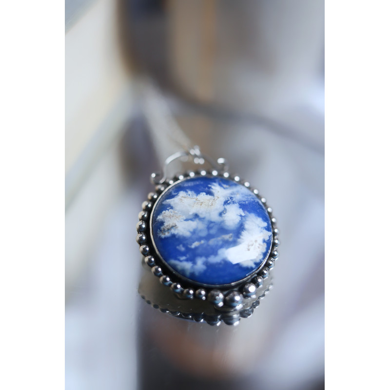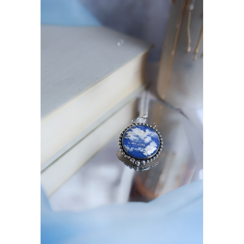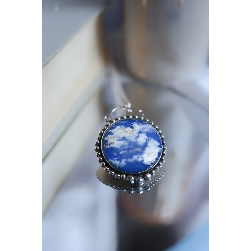 Colliers talisman ~ Les promesses d'infini ~ en argent massif 925. Il protège une merveilleuse pierre d'Agate plume doublet dans laquelle se dessine un ciel bleu puissant et ses nuages délicats. J'ai gravé au dos ces mots précieux rien que pour vous " L'horizon des possibles " & " Oser l'immense " pour que vous n'oubliez jamais de rêver aussi grand que votre ciel